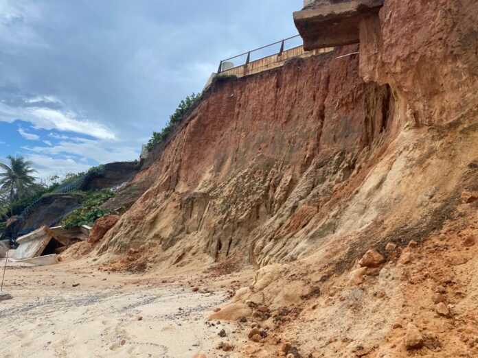 “Erosión de costa elevada” es el nombre que la ciencia otorga a semejante monumento a la transitoriedad, a este decisivo ejemplo, entre tantos, de la acelerada crisis climática. Con la magnífica elevación también se topa abruptamente la arena clara, cada vez más devorada por la mar, la basura, los depósitos de piedras de todo tipo y tamaño, los vestigios de tantos tiempos cruzados, incluyendo las construcciones humanas que han ido colapsando una tras otra desde el tope. Junto a las expuestas raíces de una palmera sobreviviente, levanto los ojos para comprobar que la más reciente construcción sobre la que despreocupadamente caminan turistas y locales pende, literalmente, de un hilo. Me falta el aire. Y a la vez, me sitian unas ganas locas de fundirme con ese sedimento que, a diferencia del cemento y sus violentos desplomes, se erosiona al ritmo de un desplazamiento granular, rodante, insistente, fatal, bello.