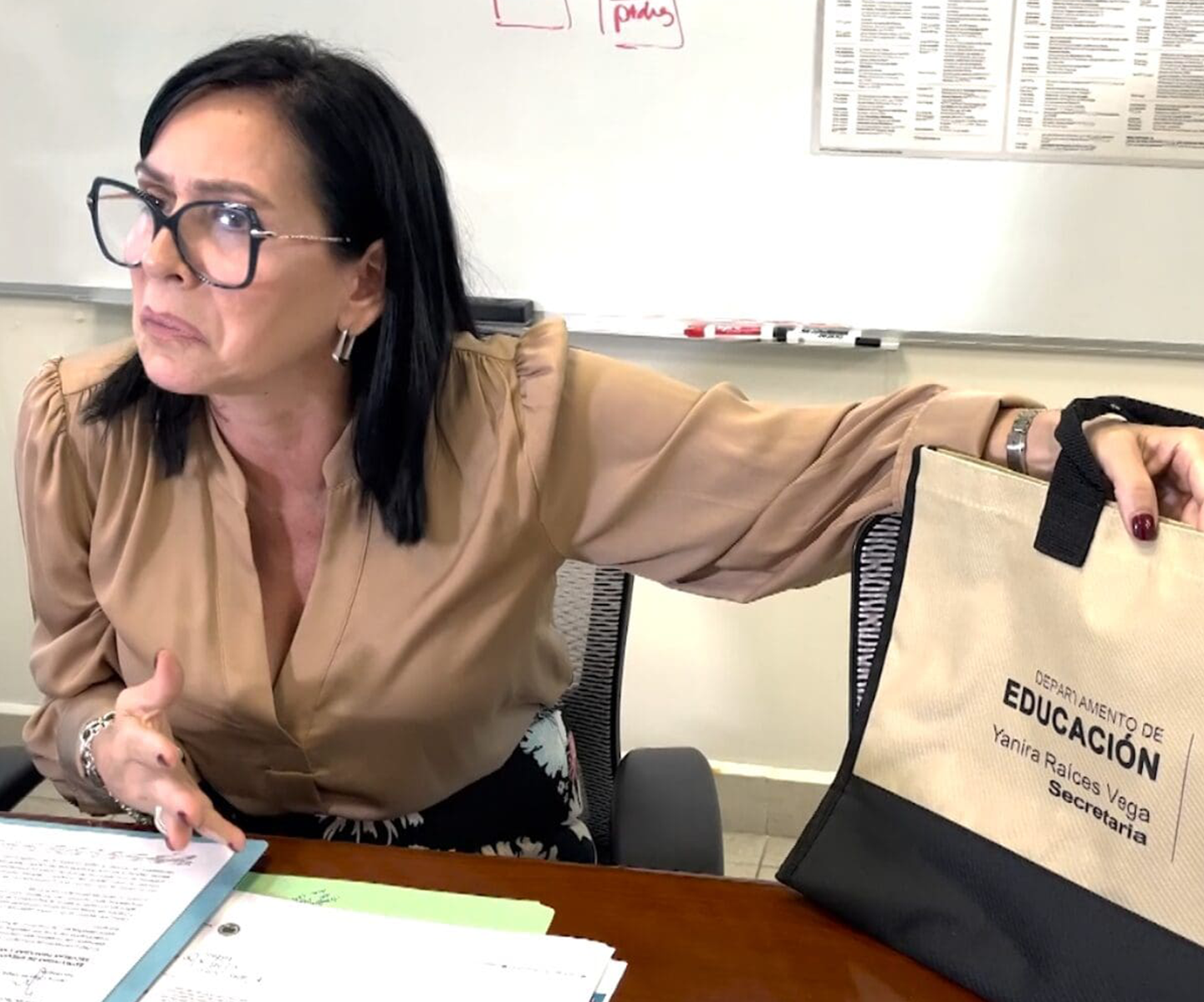 La revelación de la compra por parte del DE de 24,000 mil mochilas a un costo de $250 mil, que llevan el nombre de la secretaria y el logo de la agencia, para los y las maestras, ha levantado críticas de líderes del magisterio. Incluso la contralora, Yasmín Valdivieso, en declaraciones al Nuevo Día cuestionó cuál era el fin público de ponerle el nombre de la secretaria a las mochilas y declaró que le parecía una decisión muy desacertada de su parte.