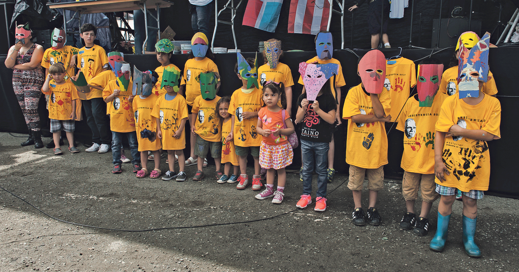 Dentro del taller cada niño/a, joven o adulto/a recibe una camiseta y participa en proyectos colectivos: pintar una bandera de RESISTENCIA y dos grandes máscaras tipo cabezudo de dragones. Alrededor de la 1:30 pm, como acto final del taller, montaremos un breve acto artístico colectivo de recitación de versos con la bandera pintada y las máscaras grandes. Será un taller más visual y verbal que los de años anteriores.