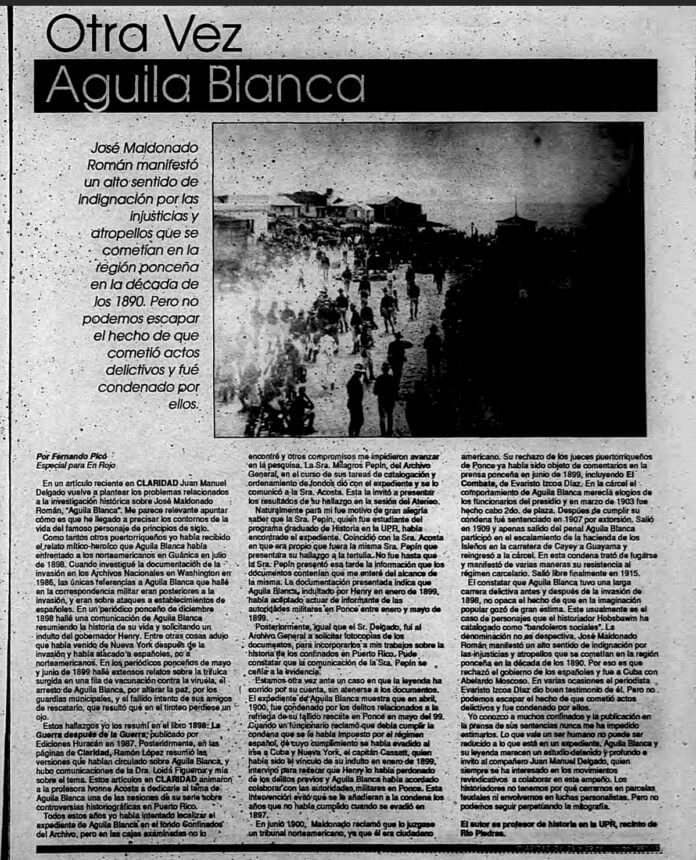 José Maldonado, el personaje, ha sufrido revisiones desde el 1897. Hace poco más de tres décadas, a través de CLARIDAD también se dialogó sobre él con intervenciones de Juan Manuel Delgado (en tres enjundiosos artículos de julio de 1993), Ivonne Acosta y Fernando Picó. Como cualquier asunto relacionado con nuestra historia, Águila Blanca se ve atravesado por asuntos ideológico. Por eso creo que hay que meterse un poquito en el asunto.