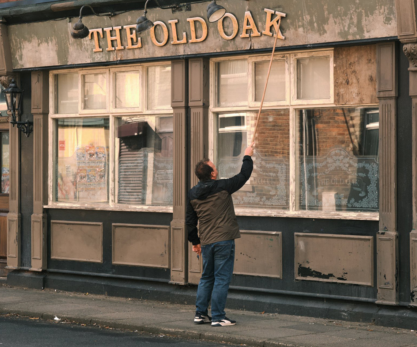 Las mujeres no parecen tener tiempo para ir al ‘pub’ The Old Oak a recordar los viejos tiempos—que nada de bueno eran porque había que trabajar duro y pasar por muchas frustraciones para conseguir algo suyo—o quejarse en grupo de los migrantes y el gobierno y repetir las mentiras que fluyen por el internet. Mientras tanto, Laura y otras mujeres del pueblo se unen a una ONG para proveerle lo básico a los migrantes, otra trabaja par de horas en el ‘pub’ y están + abiertas a conocer + de la condición de estas familias desplazadas por la guerra, en este caso específicamente de Siria. La historia gira alrededor de TJ Ballantyne, dueño del ‘pub’, que heredó de su padre y que se ha propuesto que permanezca abierto—al menos la parte principal de la barra—a pesar de no tener dinero para arreglos esenciales. Respeta el código de los bares locales de servirle la cerveza y los tragos a los clientes, escuchar sus conversaciones, afirmar con la cabeza cuando le preguntan su opinión y nunca involucrarse en temas divisivos. Por eso su ‘pub’ sigue siendo el centro de reunión de los que todavía permanecen aquí y recuerdan cómo formaron su comunidad.