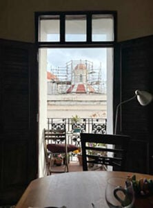 Al extremo de la mesa, Pablo toma una taza de café, y la luz entra desde el balcón a sus espaldas. Por un instante, el espacio se llena de oscuridad con el contraste, y la mirada recae afuera, al fondo, sobre la cúpula de la Basílica del Viejo San Juan; el andamiaje de la restauración, el color del paso del tiempo y la mampostería. Hay una similitud entre ellos, el conservar, el edificar sobre lo que quisimos. Los templos se mantienen.