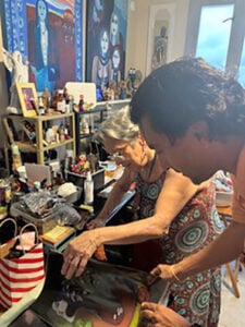 “Te puedes sentar aquí,” me dice Ana, “aquí los ves todos.” El espacio es pequeño, con el vigor de un taller de producción en plena marcha: las tijeras, los retazos de tela, los pinceles, marcadores, el adhesivo, los lápices de color. Sobre la pared, cuatro lienzos se mueven dentro del surrealismo, lo naif, la espontaneidad del recuerdo y la imaginación. Ella trabaja puramente desde la inspiración y la memoria, y sus mujeres y niños se vuelven ingrávidos dentro de gradientes azules. “Estas son las tablitas que he estado trabajando estos días.” Las tablitas, negras en su base, las utiliza para componer imágenes de santos en técnica de collage con tela, pintura y lápices de colores. “A mí me crio una costurera, mi tía. Entonces, yo estaba debajo de la máquina de coser cortando tiritas mientras ella cosía. Y Después tuve el Beauty Parlor.” La destreza en el corte le permite crear imágenes, substrayéndolas a capas de color para luego componerlas, conectarlas, como si amarrara en ello la esencia de las cosas.