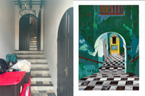 Sobre la loza criolla en la sala, Los muebles de pajilla se usan a diario, varios tiestos con pequeñas plantas y, a su lado, sobre una pequeña pila de libros hay tres obras de su madre Ada Lydia Soto Valentín (conocida en la plástica como Sotoada) en las que las imágenes de santos se elaboran en técnica de collage sobre tablas. Su perro pasa por el arco de la sala y se acuesta en el medio del recibidor.